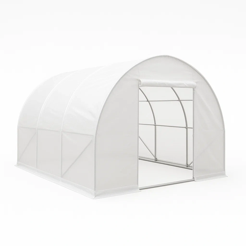 Cette serre tunnel utilise une structure en acier galvanisé solide avec une couverture en polyéthylène stabilisé offrant une bonne protection contre les intempéries.